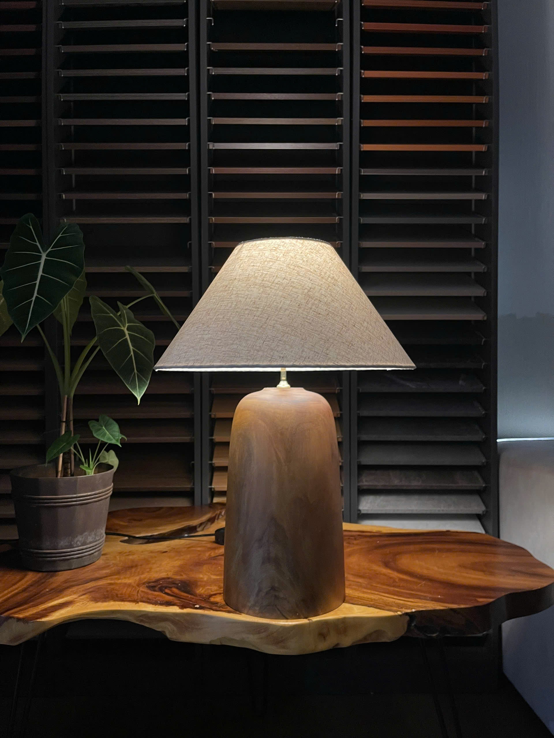 Its dome-like solid wood base is shaped and polished entirely by hand, offering a seamless, soft presence in any room. Paired with a neutral-toned linen shade, this lamp casts a warm, calming light that complements both modern and traditional interiors.